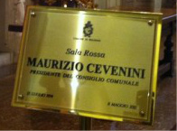 Una targhetta dorata con scritto "Sala Rossa Maurizio Cevenini. Presidente del consiglio comunale".